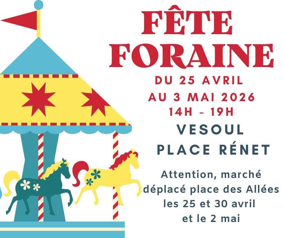 La fête foraine de Printemps s’installera place Pierre-Rénet à Vesoul du samedi 25 avril au dimanche 3 mai 2026 inclus. À cette occasion, le stationnement et la circulation seront interdits sur la place à compter du jeudi 23 avril à 12h, et ce jusqu’au lundi 4 mai inclus, afin de permettre l’installation et le démontage des attractions.